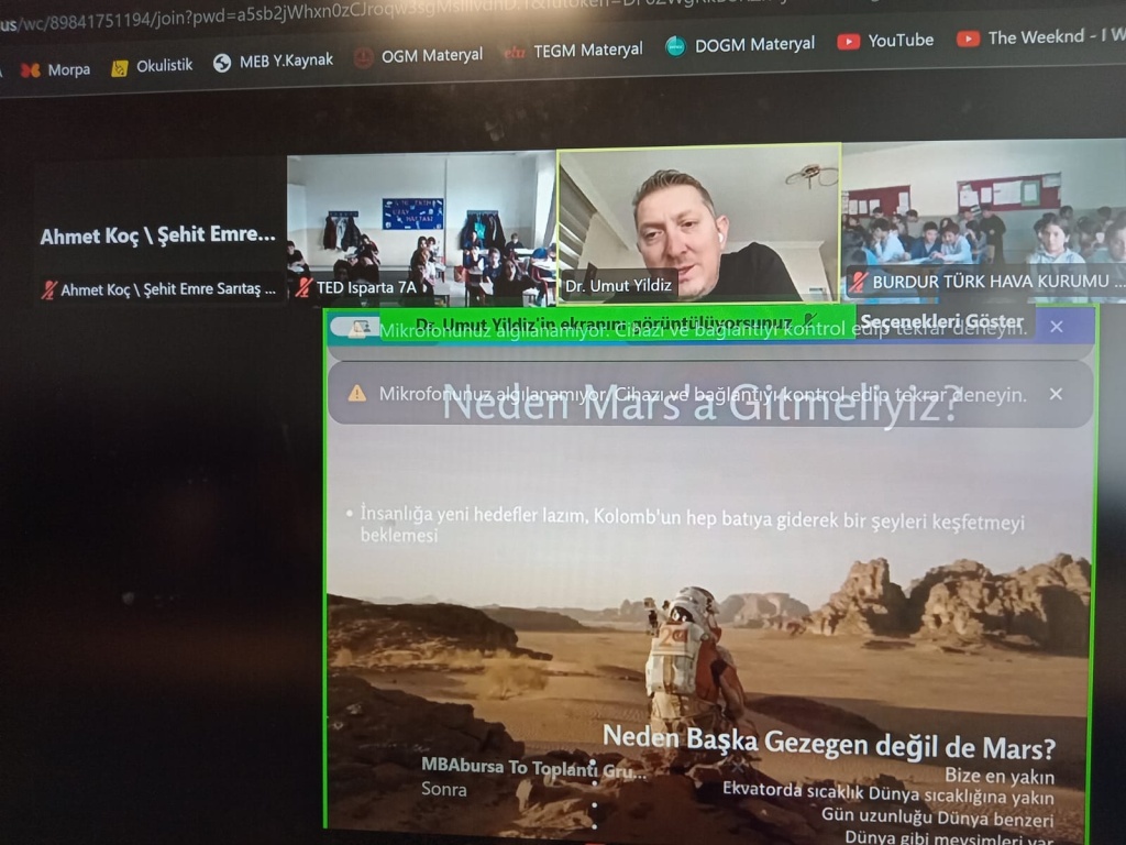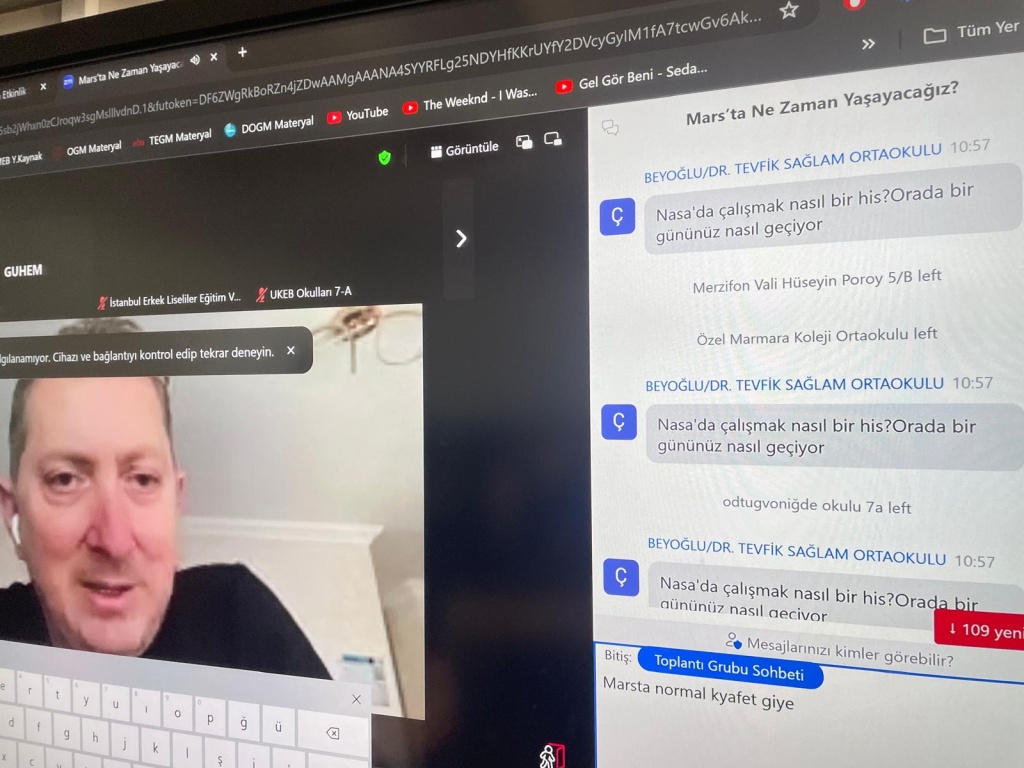 Dünya Uzay Haftası’nda 8 Ekim Salı günü saat 10:00’da eski Nasa çalışanı Dr. Umut Yıldız ile gerçekleştirilen özel bir e konferansa katılan öğrencilerimiz bu bilim dolu etkinlikte, asteroitler ve dünya üzerindeki potansiyel etkileri hakkında merak edilenleri Dr. Umut Yıldız’dan dinlediler.